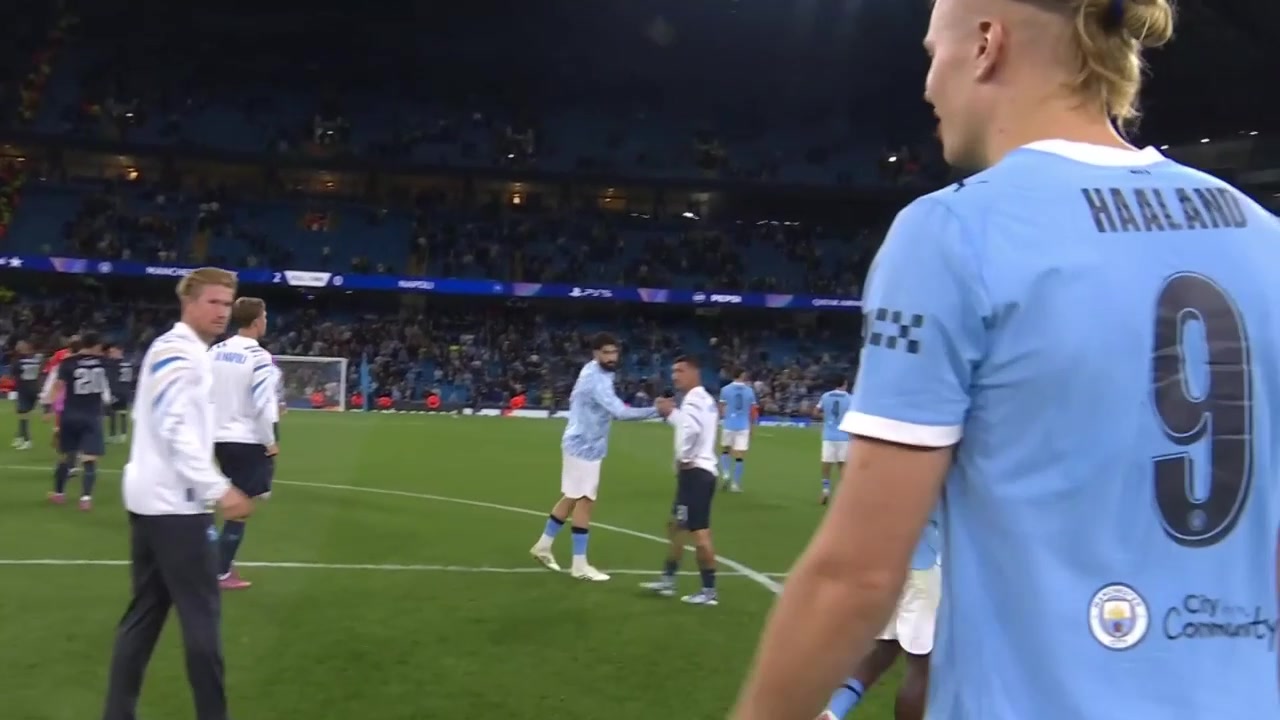 欧冠联赛阶段首轮体育录像/图片,曼城2-0那不勒斯赛后,哈兰德叫住畴昔的好搭档德布劳内。