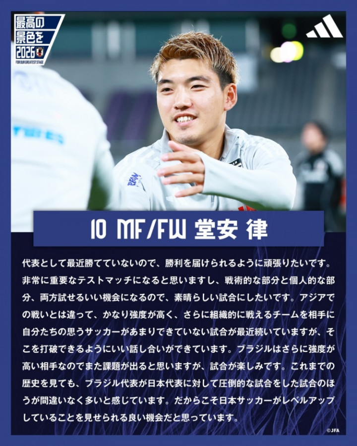 直播吧10月14日讯北京时间今晚18:30,海外友谊赛日本队将在主场迎战巴西队。日本国度队官推更新,晒出昨日教练后堂安律接管采访的执行。