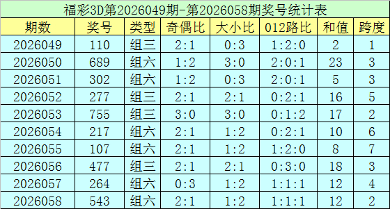 上期回想:福彩3D第2026058期开奖号码为543,组选类型为组六,奇偶比为2:1,大小比为1:2。