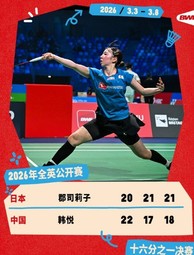 3月4日,全英羽毛球公开赛首轮比赛持续进行。女单赛场爆出一场冷门,赛会5号种子韩悦在先赢1局的情况下,连丢2局遭到了日本选手郡司莉子逆转,缺憾留步无缘16强。