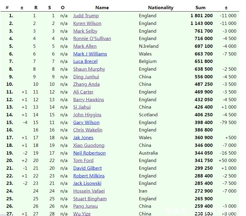 北京时候12月9日音书,2024斯诺克单局限时赛落下帷幕,小将吴宜泽打进4强,是推崇最佳的中国选手。名将汤姆-福德24年的服从终获取报,他在决赛中以31-28险得手亚姆-格雷姆夺得冠军。最新宇宙排行方面,丁俊晖依旧排在第9,特鲁姆普高居第1,奥沙利文位居第4。