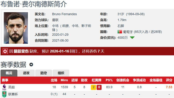 B费现年31岁,身高1.79米,右脚球员,主打前腰位置,与曼联的条约至2027年,德转估价4000万欧元,B费本赛季出战了18场英超的比赛,一齐首发,其中14场踢满全场,统统出场1538分钟,打入了5个进球,送出了8次助攻。