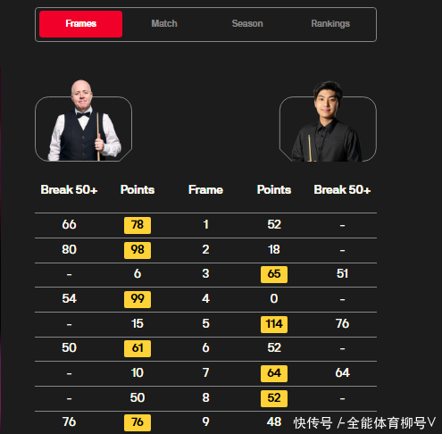 第四局,希金斯又打出单杆54分,99-0零封王雨晨,比分来到3-1。第五局,毛糙的局间休息转头之后,王雨晨单杆76分制胜,114-15再扳一局,比分追成2-3。